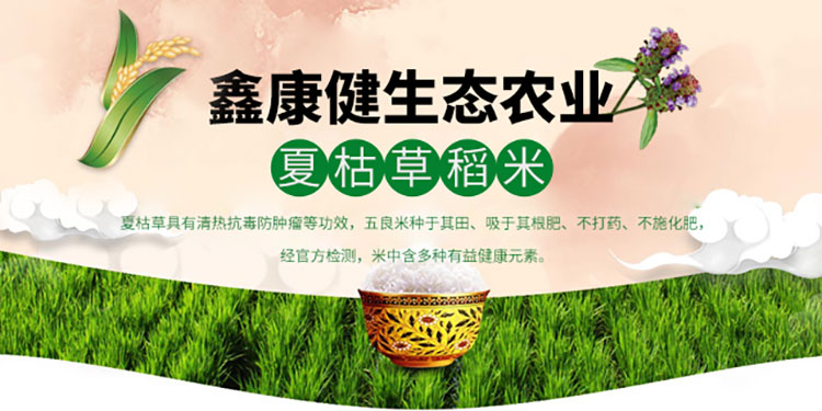 由廣藥集團江西夏枯草生態(tài)種植基地,科學(xué)輪作一季水稻,利用夏枯草根系作有:機肥,使稻米充分吸收有利于人體健康元素。同時,不施化肥,不打農(nóng)藥,確保大米更優(yōu)品質(zhì)和口感。夏枯草五良米是中國中醫(yī)科學(xué)院中藥研究所"國家工程實驗室一一夏枯草基地"定點科研項目的優(yōu)秀成果,被國家認定為綠色食品。江西鑫康健生態(tài)農(nóng)業(yè)開發(fā)有限公司秉承"種生態(tài)精品,做良心產(chǎn)品,守本份人品"之理念,全力種好中國首款生態(tài)健康的夏枯草五良米,讓追求美好生活的國人享用;好吃又健康的五良米"。